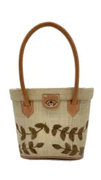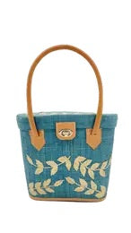 Handmade from raffia with hand embroidery, leather handles & button closure. Dimensions: 11.5”L x 4w x 9.5”H Handmade in Madagascar.
