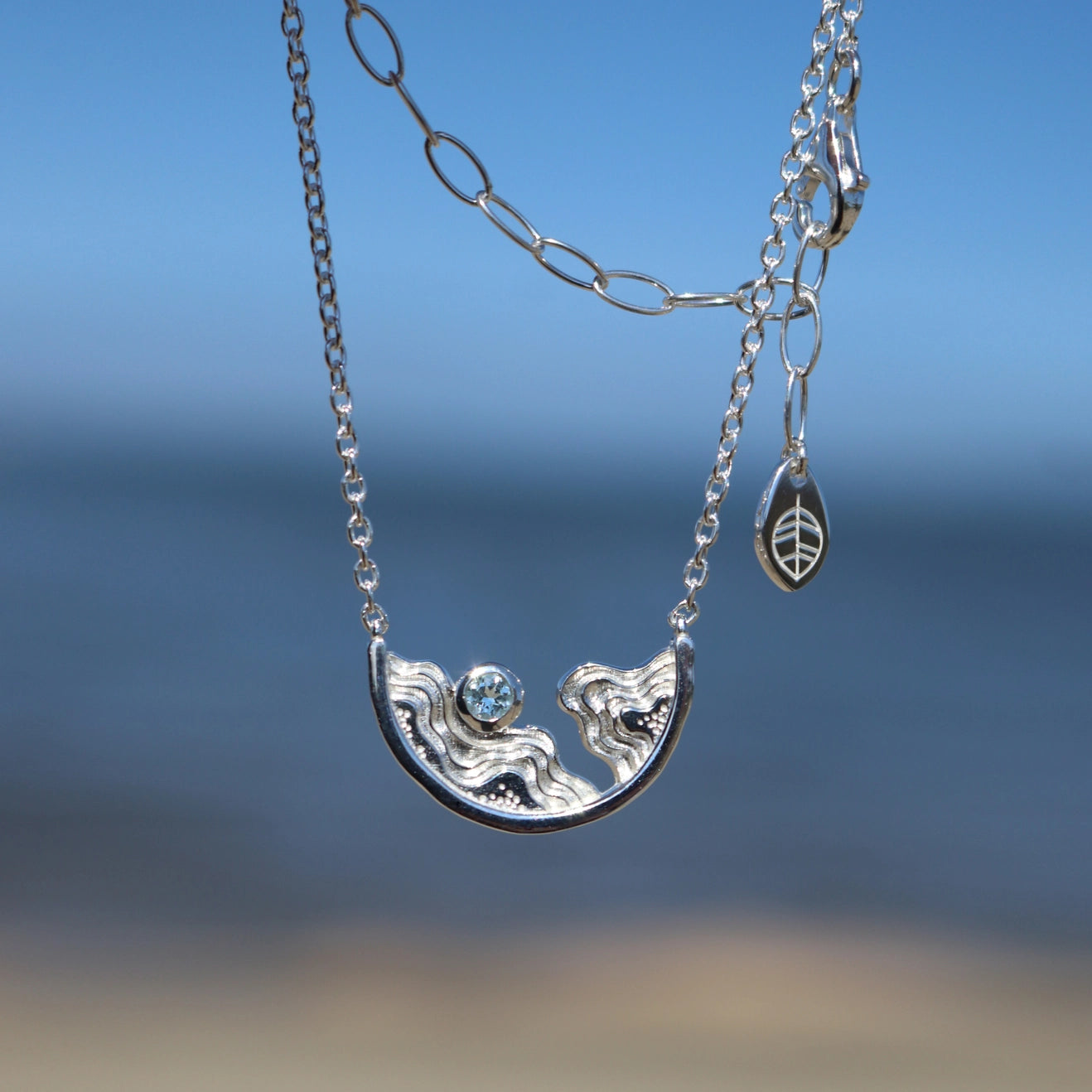 This pendant has shapes of waves with a blue topaz stone. It is made with recycled 925 Sterling Silver. Pair it with our Sanctuary Ring.