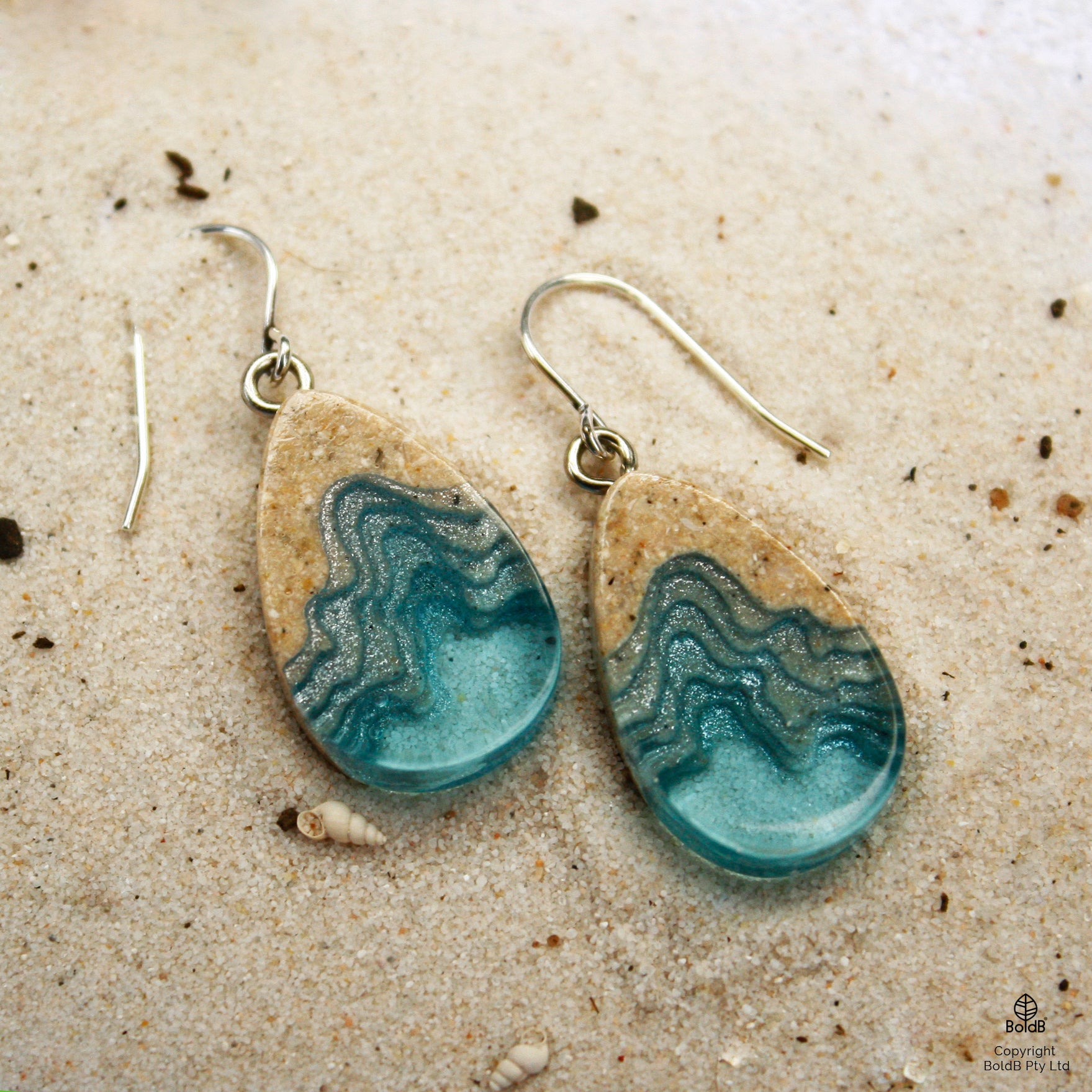 These Seashore dangle earrings have been carefully handmade from bonded beach sand, aqua blue resin and metal pigments with a high-gloss polished finish. Eye pins connect each earring to a French hook. All metal parts are rhodium plated.
